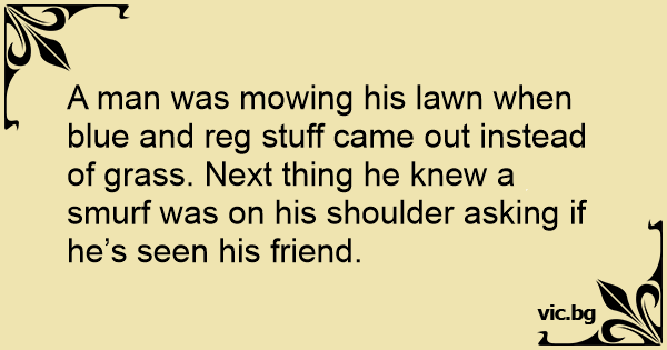 A man was mowing his lawn when blue and reg stuff came out instead of grass. Next thing he knew a smurf was on his shoulder asking if he’s seen his friend.