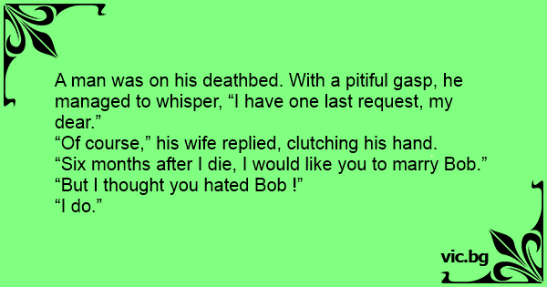A man was on his deathbed. With a pitiful gasp, he managed to whisper, “I have one last request, my dear.”