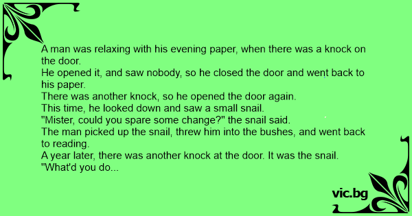 "Mister, could you spare some change?" the snail said.