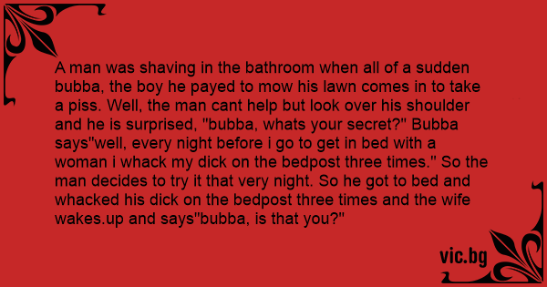 A man was shaving in the bathroom when all of a sudden bubba, the boy he payed to mow his lawn comes in to take a рiss. Well, the man cant help but look over his shoulder and he is surprised, "bubba, whats your secret?" Bubba says"well, every night before i go to get in bed with a woman i whack my diск on the bedpost three times." So the man decides to try it that very night. So he got to bed and whacked his diск on the bedpost three times and the wife wakes.up and says"bubba, is that you?"