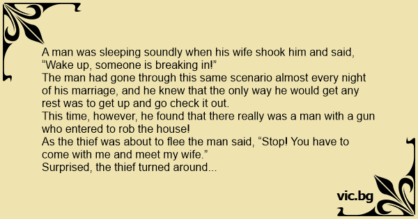 As the thief was about to flee the man said, “Stop! You have to come with me and meet my wife.”