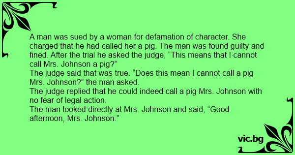A man was sued by a woman for defamation of character. She charged that he had called her a pig. The man was found guilty and fined. After the trial he asked the judge, “This means that I cannot call Mrs. Johnson a pig?”