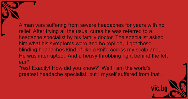 ‘Yes! Exactly! How did you know?’ ‘Well I am the world’s greatest headache specialist, but I myself suffered from that same type of headache for many years. It is caused by a tension in the scalp muscles. This is how I cured it: Every day I would give my wife оrаl sеx. When she came she would squeeze her legs together with all her strength and the pressure would relieve the tension in my head. Try that every day for two weeks and come back and let me know how it goes.’