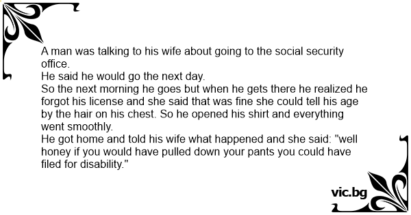 He got home and told his wife what happened and she said: "well honey if you would have pulled down your pants you could have filed for disability."