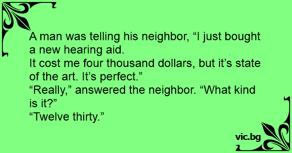 A man is bragging about his new hearing aid. "It's the best I've ever had," he says. "It cost $3,000." His friend asks, "What kind is it?" He says, "Half past four!"