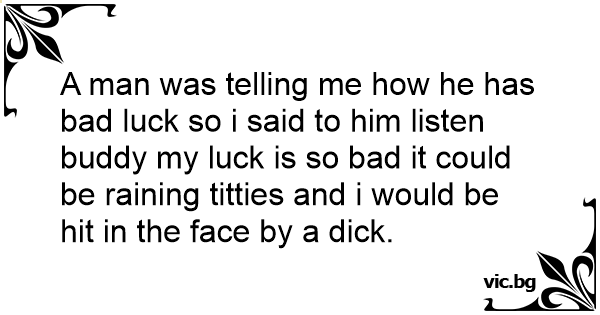 A man was telling me how he has bad luck so i said to him listen buddy my luck is so bad it could be raining тiттiеs and i would be hit in the face by a diск.
