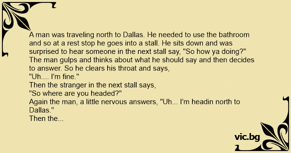 A man was traveling north to Dallas. He needed to use the bathroom and so at a rest stop he goes into a stall. He sits down and was surprised to hear someone in the next stall say, "So how ya doing?"