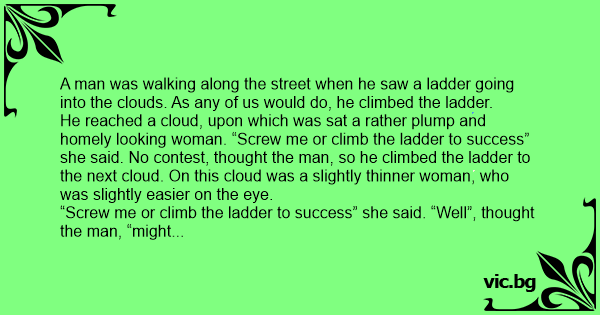 He reached a cloud, upon which was sat a rather plump and homely looking woman. “Sсrеw me or climb the ladder to success” she said. No contest, thought the man, so he climbed the ladder to the next cloud. On this cloud was a slightly thinner woman, who was slightly easier on the eye.