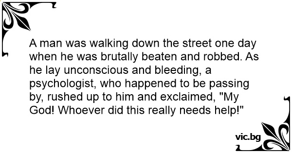 A man was walking down the street one day when he was brutally beaten and robbed. As he lay unconscious and bleeding, a psychologist, who happened to be passing by, rushed up to him and exclaimed, "My God! Whoever did this really needs help!"