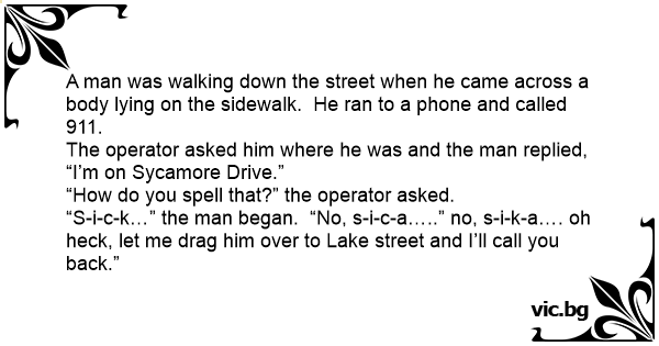 The operator asked him where he was and the man replied, “I’m on Sycamore Drive.”
