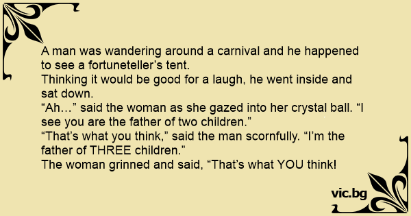En man som är på ett tivoli bestämmer sig för att gå till en spådam för skojs skull. - Jag ser att du är far till två barn, säger spådamen. - HA. Det är vad du tror, säger mannen skadeglatt. Jag är far till tre barn. - HA, säger spådamen. Det är...