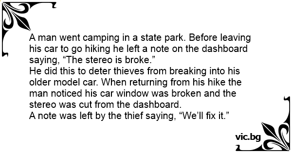 A man went camping in a state park. Before leaving his car to go hiking he left a note on the dashboard saying, “The stereo is broke.”