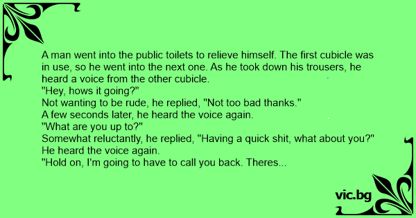 A man went into the public toilets to relieve himself. The first cubicle was in use, so he went into the next one. As he took down his trousers, he heard a voice from the other cubicle.
