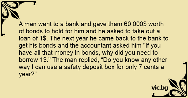 A man went to a bank and gave them 60 000$ worth of bonds to hold for him and he asked to take out a loan of 1$. The next year he came back to the bank to get his bonds and the accountant asked him "If you have all that money in bonds, why did you need to borrow 1$." The man replied, “Do you know any other way I can use a safety deposit box for only 7 cents a year?"