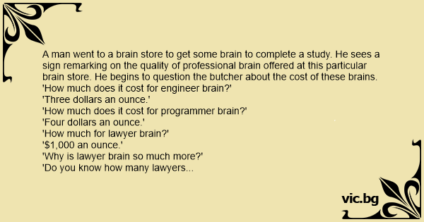 A man went to a brain store to get some brain to complete a study. He sees a sign remarking on the quality of professional brain offered at this particular brain store. He begins to question the butcher about the cost of these brains.