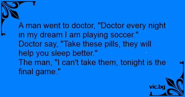 Приходит больной к врачу: - Доктор, помогите, уже месяц не сплю спокойно. Мне постоянно снятся крысы, которые играют в футбол. - Вот вам микстура, выпейте, у вас все пройдет. - А можно я выпью ее послезавтра? - Да, но почему? - А у них завтра финал!