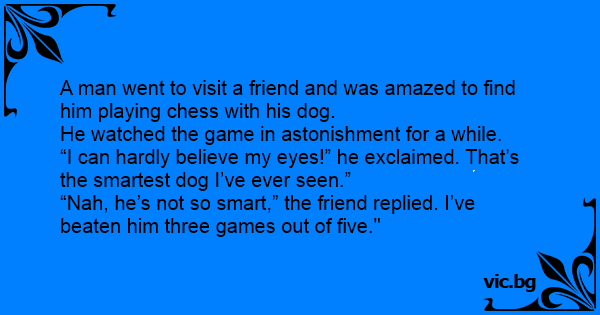 En mann besøkte sin venn og så forskrekket at vennen spilte sjakk med hunden sin. Han så på en stund, før han utbrøt: - ”Det er den smarteste hunden jeg har sett!” - ”Næh, han er ikke så smart”,...