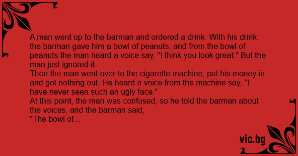 A man went up to the barman and ordered a drink. With his drink, the barman gave him a bowl of peanuts, and from the bowl of peanuts the man heard a voice say, "I think you look great." But the man just ignored it.