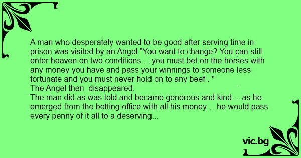A man who desperately wanted to be good after serving time in prison was visited by an Angel "You want to change? You can still enter heaven on two conditions …you must bet on the horses with any money you have and pass your winnings to someone less fortunate and you must never hold on to any beef . "