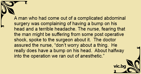 A man who had come out of a complicated abdominal surgery was complaining of having a bump on his head and a terrible headache. The nurse, fearing that the man might be suffering from some post operative shock, spoke to the surgeon about it. The doctor assured the nurse, “don’t worry about a thing. He really does have a bump on his head. About halfway into the operation we ran out of anesthetic.”