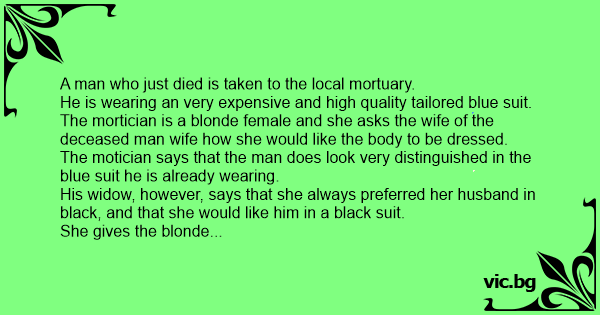 "Honestly," the blonde says, "It cost me nothing. You see, a deceased gentleman of about your husbands size was brought in yesterday shortly after you left, he was dressed in a very attractive black suit. I asked his wife if she minded him going to his grave wearing a beautifully tailored blue suit instead, and she said it did not make any difference as long as he looked good..."