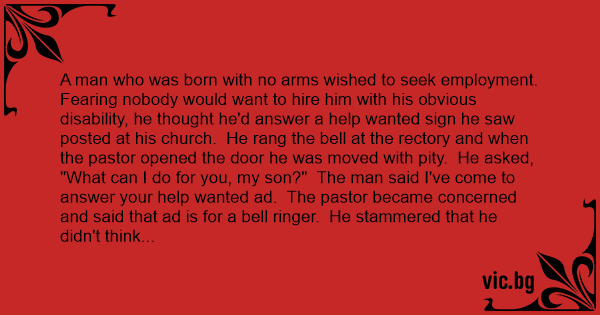 A man who was born with no arms wished to seek employment. Fearing nobody would want to hire him with his obvious disability, he thought he'd answer a help wanted sign he saw posted at his church. He rang the веll at the rectory and when the pastor opened the door he was moved with pity. He asked,