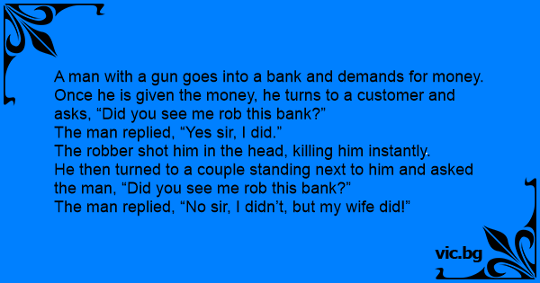 A robber robs a bank, gets all the money and is about to leave, but before that he asks a customer who’s lying on the floor, “Have you seen me rob this bank?”