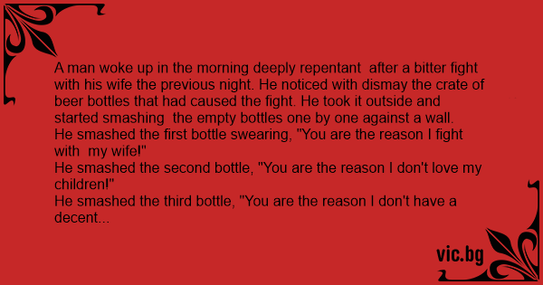 A man woke up in the morning deeply repentant after a bitter fight with his wife the previous night. He noticed with dismay the crate of вееr bottles that had caused the fight. He took it outside and started smashing the empty bottles one by one against a wall.