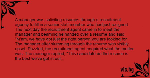"M'am, we have got just the right person you are looking for. The manager after skimming through the resume was visibly upset. Puzzled, the recruitment agent enquired what the matter was. The manager replied, "This candidate on the resume is the best we've got in our department".