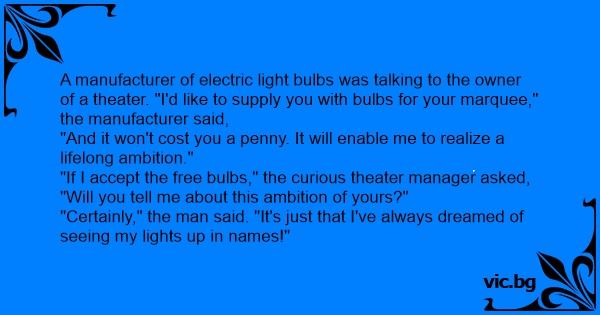 A manufacturer of electric light bulbs was talking to the owner of a theater. "I'd like to supply you with bulbs for your marquee," the manufacturer said,
