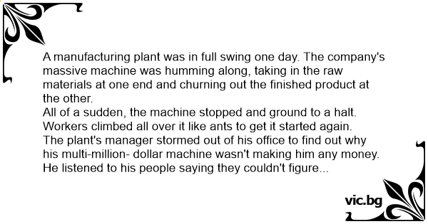 A manufacturing plant was in full swing one day. The company's massive machine was humming along, taking in the raw materials at one end and churning out the finished product at the other.