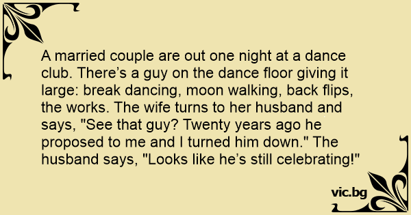 A married couple are out one night at a dance club. There’s a guy on the dance floor giving it large: break dancing, moon walking, back flips, the works. The wife turns to her husband and says, "See that guy? Twenty years ago he proposed to me and I turned him down." The husband says, "Looks like he’s still celebrating!"