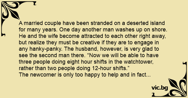 A married couple have been stranded on a deserted island for many years. One day another man washes up on shore. He and the wife become attracted to each other right away, but realize they must be creative if they are to engage in any hanky-panky. The husband, however, is very glad to see the second man there. “Now we will be able to have three people doing eight hour shifts in the watchtower, rather than two people doing 12-hour shifts.”