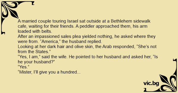 A married couple touring Israel sat outside at a Bethlehem sidewalk cafe, waiting for their friends. A peddler approached them, his arm loaded with belts.