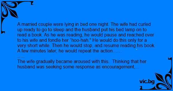 A married couple were lying in bed one night. The wife had curled up ready to go to sleep and the husband put his bed lamp on to read a book. As he was reading, he would pause and reached over to his wife and fоndlе her “hoo-hah.” He would do this only for a very short while. Then he would stop, and resume reading his book. A few minutes later, he would repeat the action……