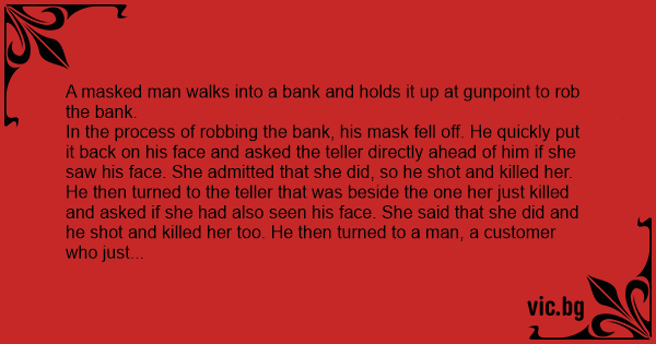 A bank robber wanted to keep his identity secret, but didn't wear a balaclava. He told all in the bank not to look at him or he would shoot them. One foolhardy customer sneaked a look, and the robber promtply shot him. The robber asked if anyone else had seen his face. One customer, gazing...