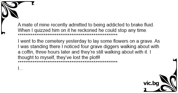 I went to the cemetery yesterday to lay some flowers on a grave. As I was standing there I noticed four grave diggers walking about with a coffin, three hours later and they’re still walking about with it. I thought to myself, they’ve lost the plot!!
