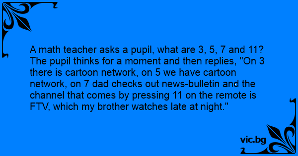 The pupil thinks for a moment and then replies, "On 3 there is cartoon network, on 5 we have cartoon network, on 7 dad checks out news-bulletin and the channel that comes by pressing 11 on the remote is FTV, which my brother watches late at night."