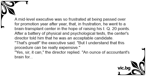 A mid-level executive was so frustrated at being passed over for promotion year after year, that, in frustration, he went to a brain-transplant center in the hope of raising his I. Q. 20 points.