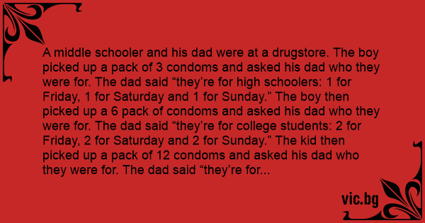 A middle schooler and his dad were at a drugstore. The boy picked up a pack of 3 condoms and asked his dad who they were for. The dad said “they’re for high schoolers: 1 for Friday, 1 for Saturday and 1 for Sunday.” The boy then picked up a 6 pack of condoms and asked his dad who they were for. The dad said “they’re for college students: 2 for Friday, 2 for Saturday and 2 for Sunday.” The kid then picked up a pack of 12 condoms and asked his dad who they were for. The dad said “they’re for married men: 1 for January, 1 for February…”