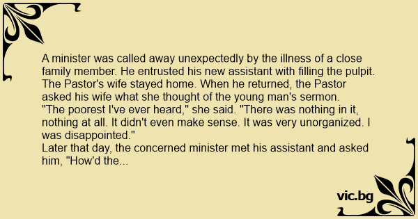 Later that day, the concerned minister met his assistant and asked him, "How'd the Sunday service and sermon go? Did all go well? How did you manage?"