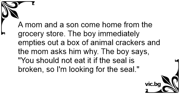A mom and a son come home from the grocery store. The boy immediately empties out a box of animal crackers and the mom asks him why. The boy says,