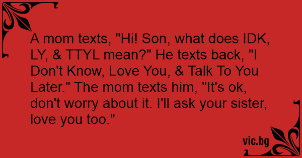 A mom texts, "Hi! Son, what does IDK, LY, & TTYL mean?" He texts back, "I Don't Know, Love You, & Talk To You Later." The mom texts him, "It's ok, don't worry about it. I'll ask your sister, love you too."