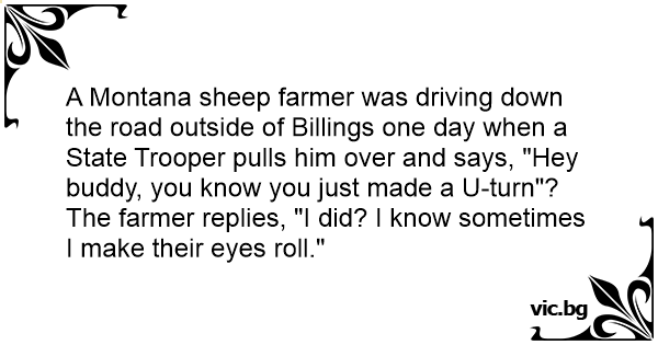 A Montana sheep farmer was driving down the road outside of Billings one day when a State Trooper pulls him over and says, "Hey buddy, you know you just made a U-turn"?