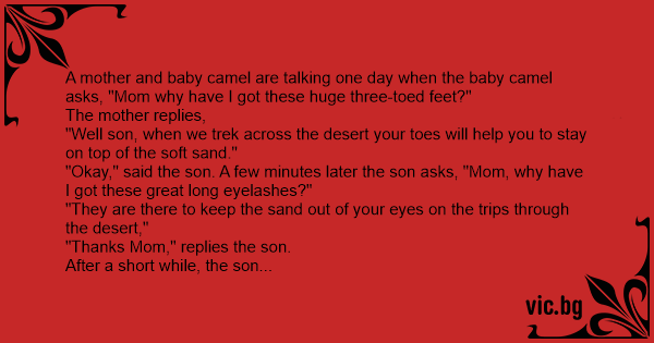 Genç deve sorar: - Anne niye bizim ayaklarımız bu kadar büyük? Anne cevap vermiş: - Çölde kuma batmamak için. Genç deve tekrar sormuş: - Peki kirpiklerimiz niye bu kadar gür? Anne tekrar cevap...