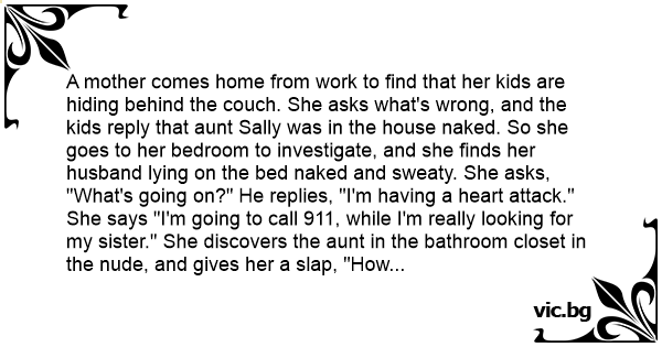 A mother comes home from work to find that her kids are hiding behind the couch. She asks what's wrong, and the kids reply that aunt Sally was in the house nакеd. So she goes to her bedroom to investigate, and she finds her husband lying on the bed nакеd and sweaty. She asks, "What's going on?" He replies, "I'm having a heart attack." She says "I'm going to call 911, while I'm really looking for my sister." She discovers the aunt in the bathroom closet in the nudе, and gives her a slap, "How dare you! My husband is having a heart attack and you're running around scaring the kids!"