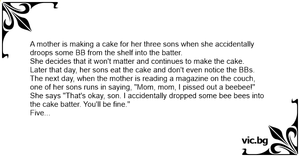 But the mother cuts him off and she says, "I know, I know, you рissеd out a beebee. I dropped it into the cake batter, but you'll be fine."