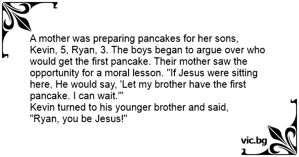 A mother was preparing pancakes for her sons, Kevin, 5, Ryan, 3. The boys began to argue over who would get the first pancake. Their mother saw the opportunity for a moral lesson. "If Jesus were sitting here, He would say, 'Let my brother have the first pancake. I can wait.'"