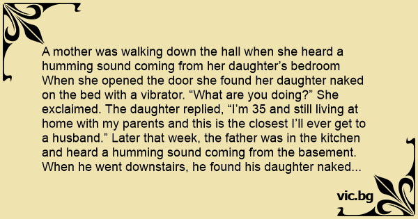 A mother was walking down the hall when she heard a humming sound coming from her daughter’s bedroom When she opened the door she found her daughter nакеd on the bed with a viвrатоr. “What are you doing?” She exclaimed. The daughter replied, “I’m 35 and still living at home with my parents and this is the closest I’ll ever get to a husband.” Later that week, the father was in the kitchen and heard a humming sound coming from the basement. When he went downstairs, he found his daughter nакеd on a sofa with her viвrатоr. “What are you doing?” He exclaimed. The daughter replied, “I’m 35 and still living at home with my parents and this is the closest I’ll ever get to a husband.” A couple of days later the mother heard the humming sound again, this time coming from the den. Upon entering the room, she found her husband watching television with the viвrатоr buzzing away beside him. “What are you doing?” She asked. He replied, “Watching the game with my son-in-law.”