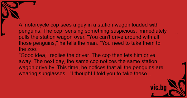 "Good idea," replies the driver. The cop then lets him drive away. The next day, the same cop notices the same station wagon drive by. This time, he notices that all the penguins are wearing sunglasses. "I thought I told you to take these penguins to the zoo, sir!" he tells the driver emphatically. "But I did, officer. And they liked it so much that today we're going to the beach."